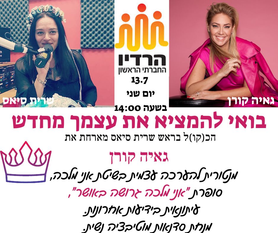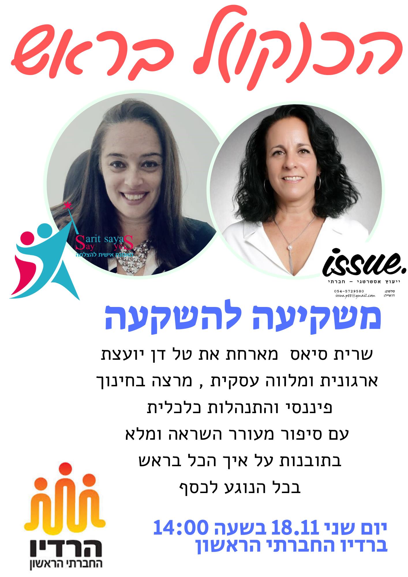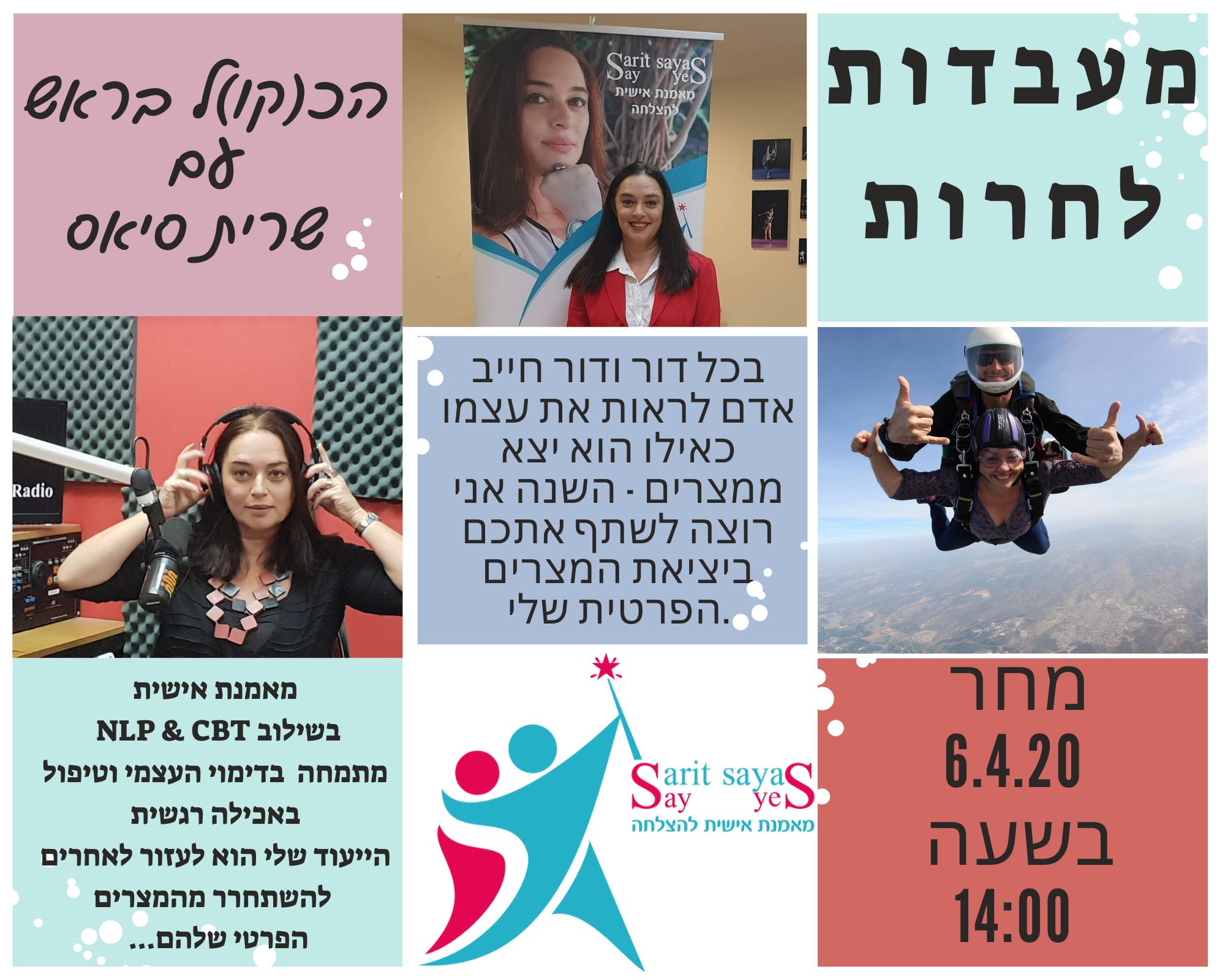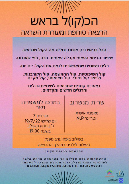 הרצאה סוחפת , מעוררת השראה של שרית מנשרוב סיפור אישי של החלמה מהפרעות אכילה שיפור הדימוי העצמי וקבלה עצמית -ככה ככה כפי שאנחנו ! כלים פשוטים שמאפשרים לנצח את הקול ... יום יום קול השיפוטיות, קול האשמה , קול הקורבנות ולייצר קול חיובי , קול מציאותי , קול מקדם בצעדים קטנים שמובילים לשינויים גדולים והרגלים חדשים ומקדמים.